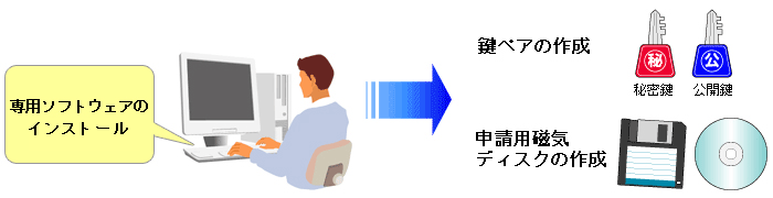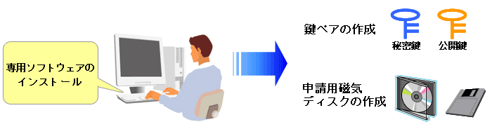 A専用ソフトウェアは,電子署名をする際に使用する秘密鍵の作成(秘密鍵と対となる公開鍵も作成),電子証明書の発行請求の際に必要となるCD−R又はフロッピーディスク(以下「申請用磁気ディスク」という。)の作成及びオンラインにより電子証明書を取得する際に必要になります。
