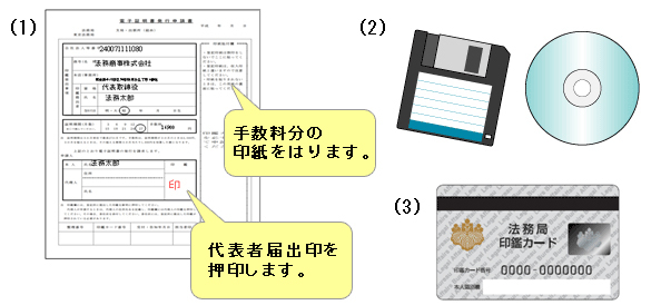 A電子証明書の発行請求を行う際には,法人の本店又は主たる事務所を管轄する登記所(以下「管轄登記所」といいます。)に,(1) 電子証明書発行申請書及び(2) 申請用磁気ディスクを提出するほか,(3) 印鑑カードを提示する必要があります。