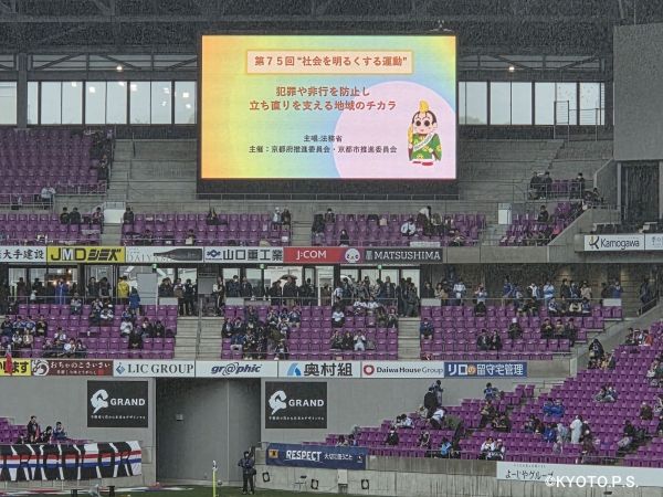 令和7年11月9日(日)、京都サンガスタジアムにおいて、コラボグッズの配布を行うとともに、電光掲示板と場内アナウンスにより、“社会を明るくする運動”の啓発活動を実施しました。京都サンガF.C.の御協力に感謝いたします。