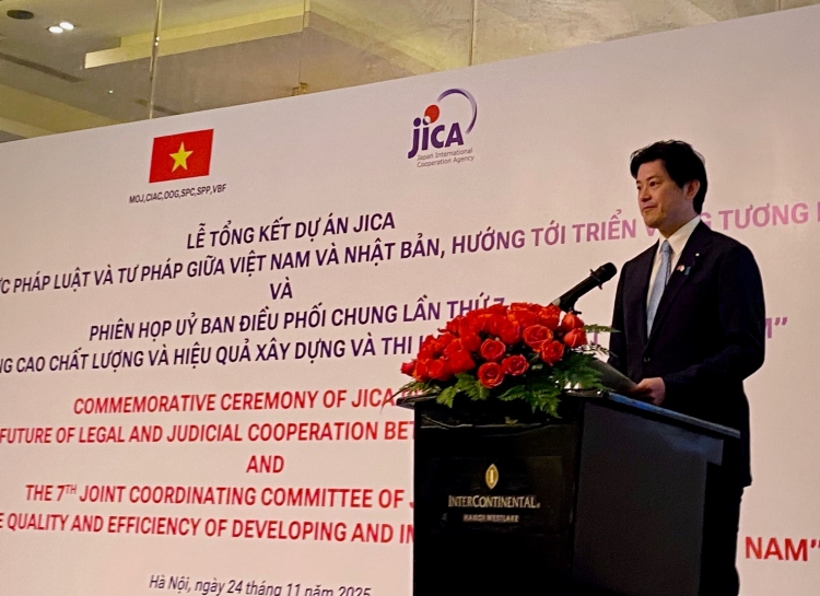 On November 24, 2025, a commemorative ceremony marking past JICA projects and a new era of cooperation between Japan and Vietnam in the field of law and justice was held in Hanoi, Vietnam, bringing together relevant parties from both countries. On this occasion, State Minister of Justice MITANI attended to review and evaluate the achievements of the legal technical assistance, which has been implemented for over 30 years with the cooperation of the Ministry of Justice of Japan. At the ceremony, State Minister of Justice MITANI emphasized the importance of Japan and Vietnam further enhancing their cooperation in the field of law and justice through legal technical assistance and new joint research initiatives.