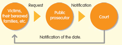 Victims and their bereaved families shall ask the public prosecutor in charge for participation in criminal trials. The public prosecutor will notify the court along with the opinion on whether the victim should participate. |