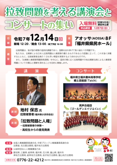 拉致問題その他北朝鮮当局による人権侵害問題についての関心と理解を深めることを目的として、全国人権擁護委員連合会、中部ブロック人権擁護委員連合会、名古屋法務局及び福井地方法務局と共催で「拉致問題を考える講演会とコンサートの集い」を開催します。