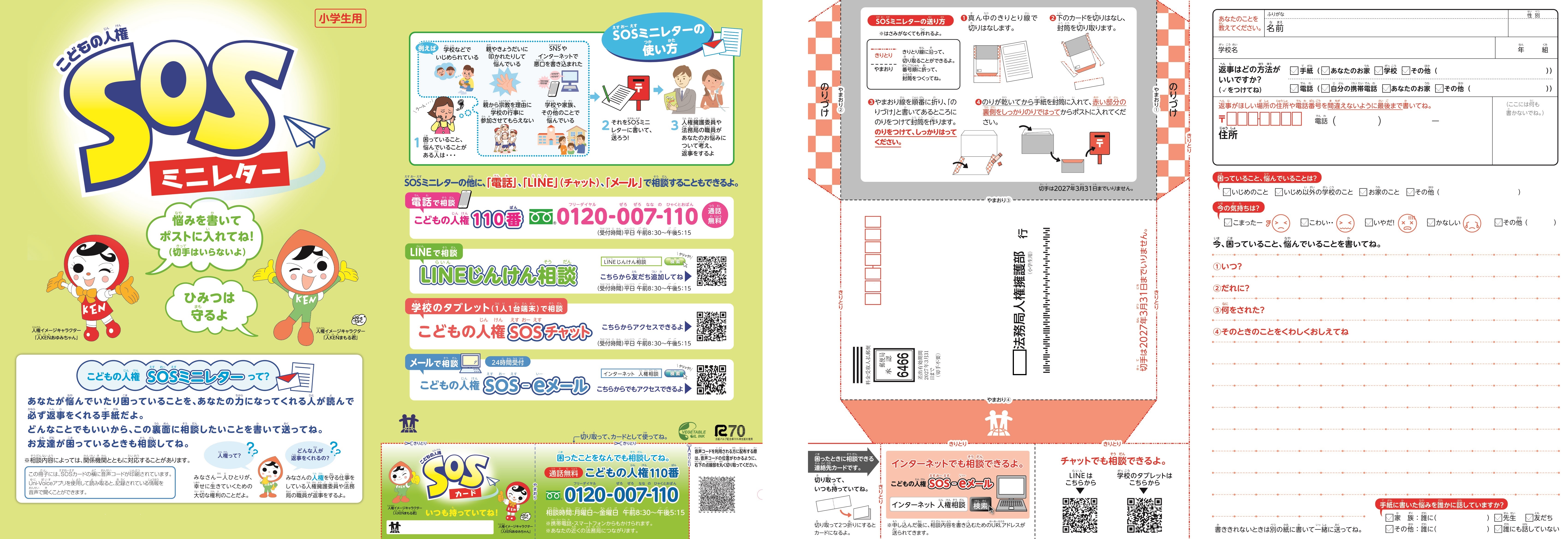 学校におけるいじめを始め、こどもをめぐる様々な人権問題の解決を図るため、全国の小中学校に「こどもの人権SOSミニレター」(料金受取人払の便箋兼封筒・はがき)を配布します。