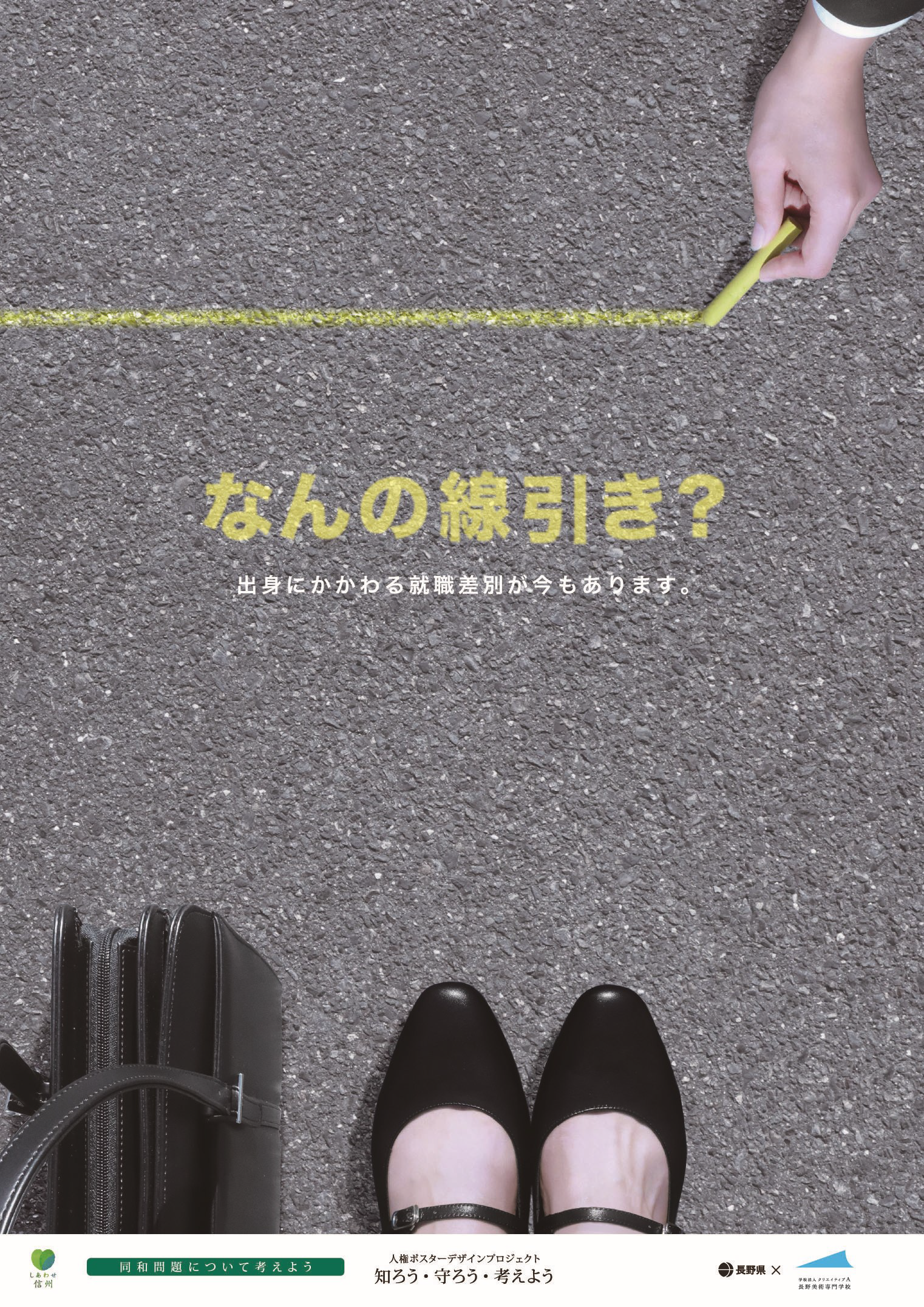 『「なんの線引き?」 出身にかかわる就職差別が今もあります。――同和問題について考えよう』(長野美術専門学校との連携による人権ポスター)
