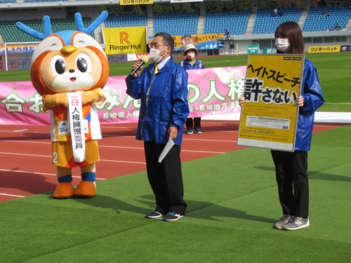 セレモニーでのトークショーでは,「ヘイトスピーチ,許さない。」のポスターを掲げながら,ヘイトスピーチ解消を呼びかけました。イベントの様子は,スタジアム内の大型ビジョンに映し出されるとともに,V・ファーレン長崎のYouTubeチャンネル(YouTubeのV・ファーレン長崎公式チャンネルにリンク)で生配信されました。