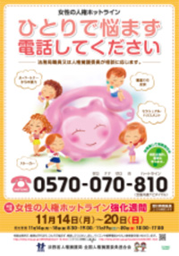 法務省人権擁護局及び全国人権擁護委員連合会では,「女性に対する暴力をなくす運動」(毎年11月12日から同月25日まで)実施期間中の11月14日(月)から20日(日)まで,全国一斉「女性の人権ホットライン」強化週間を実施します。