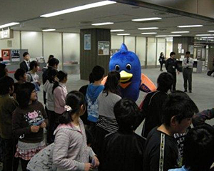 成田空港支局職員から,「とりぶ」が紹介され登場すると,子ども達から一斉に歓声が沸き起こり,「かわいい!」「大きい!」との声が上がり、ポーズを決めて皆にアピールする「とりぶ」でした。 |