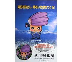 最後に,カタックリちゃんの主な活動内容について紹介します。 カタックリちゃんは,主に,旭川刑務所製作のポスターやしおりなどに登場しています。 |