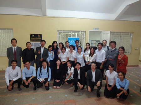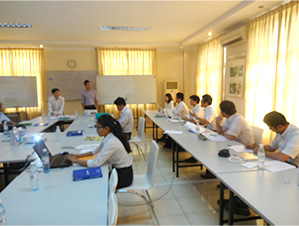 また,今回の研修では,名古屋大学がカンボジアに設立した日本法教育センターを訪問し,日本語を専攻しているカンボジアの学生に対して,研修員が「不法行為(交通事故事案における論点)」「間接事実による立証」というテーマで日本語による日本の法律に関する講義を行いました。カンボジアの学生からは鋭い質問も飛び出し,その純粋で熱心な勉学意欲に研修員は刺激を受けました。