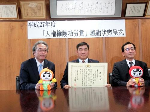 この「人権擁護功労賞」は,人権擁護委員の活動等を通じて関わりのある企業やNPO法人等の団体及び個人の中から,人権擁護上,顕著な功績があったと認められた方に対し,法務大臣及び全国人権擁護委員連合会会長が表彰を行うもので,12月中に法務省及び各法務局・地方法務局において表彰伝達式が執り行われました。