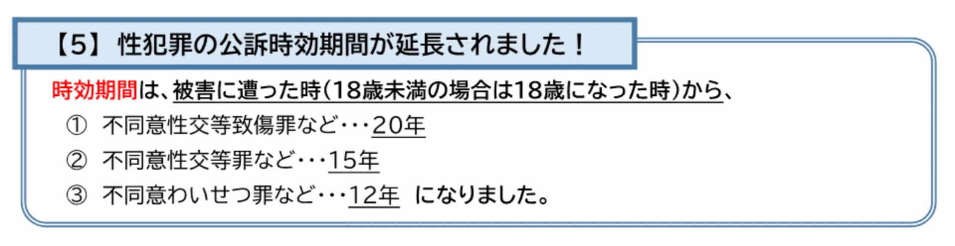そこで、今回の法改正では、性犯罪についての公訴時効期間が延長されました。
