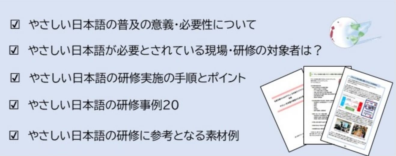など、研修の企画・実施を行う地方公共団体等の職員等に、ノウハウが乏しかったため、令和4年度に出入国在留管理庁と文化庁は、研修の企画・実施のための情報や研修教材等を分かりやすくまとめた「やさしい日本語の研修のための手引」を作成しました。
