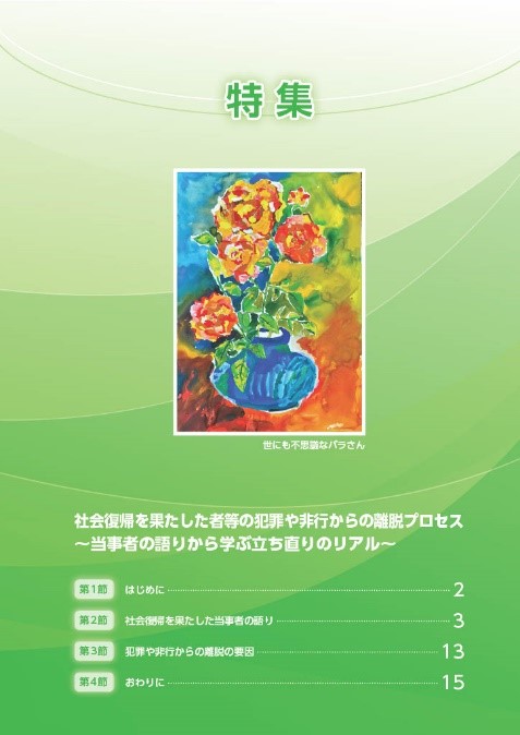 今回の特集は、「社会復帰を果たした者等の犯罪や非行からの離脱プロセス~当事者の語りから学ぶ立ち直りのリアル~」です。