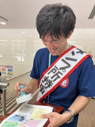 工夫というほどではないんですが、あまり簡単に全部のスタンプが集まってしまってもおもしろくないと思い、三つのスタンプのうち二つはイベントブースなどに設置し、最後の一つは、私が「スタンプ所持中」と書いた「たすき」をして、常時持ち歩くことにしたんです。