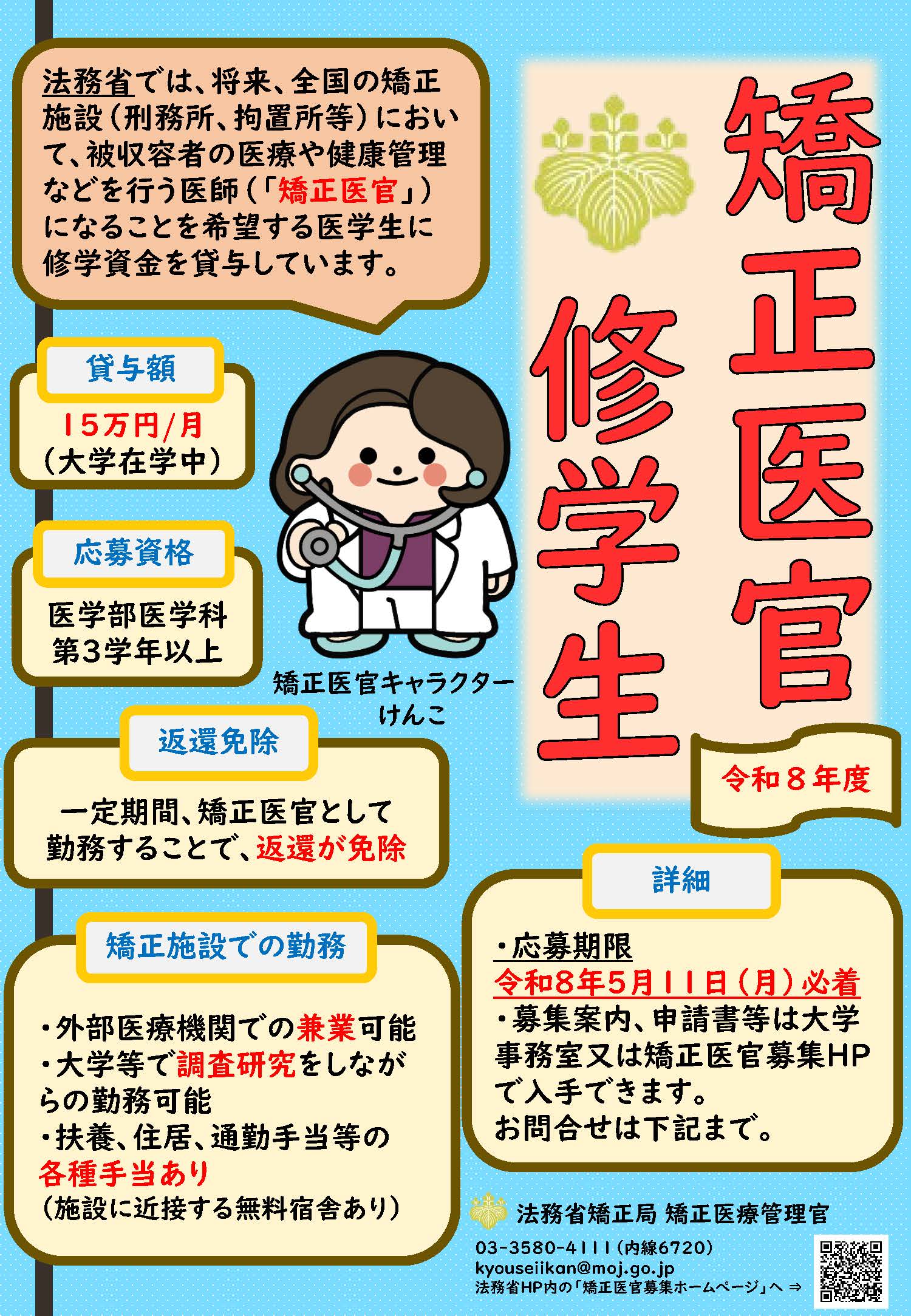 法務省では、将来、全国の矯正施設において被収容者の医療や健康管理など行う医師(「矯正医官」)となることを希望する医学生に修学資金を貸与しています。