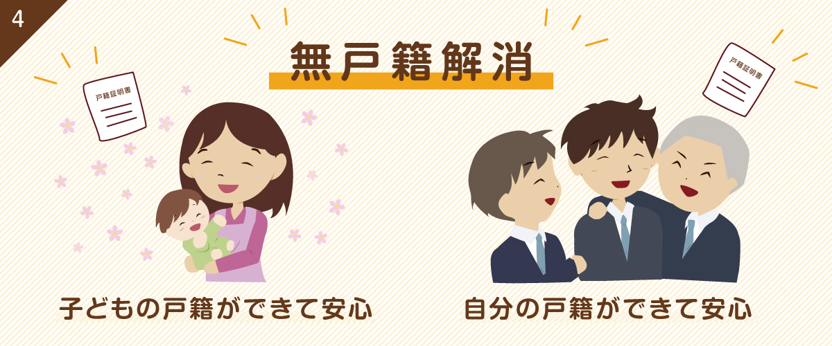 法務省では、出生の届出がされておらず、無戸籍となっている方々について、その実情に応じた案内をするため、全国各地の法務局に相談窓口を設け、戸籍をつくっていただくための丁寧な手続案内をする等、様々な取組を行っています。