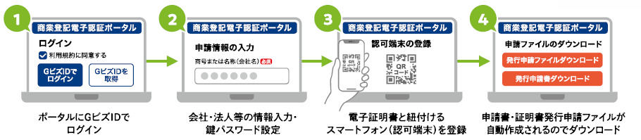 商業登記リモート署名に対応した商業登記電子証明書は、「商業登記電子認証ポータル」で発行申請に必要なデータを作成し、登記所(法務局)へ発行申請することで取得(登録)することができます。