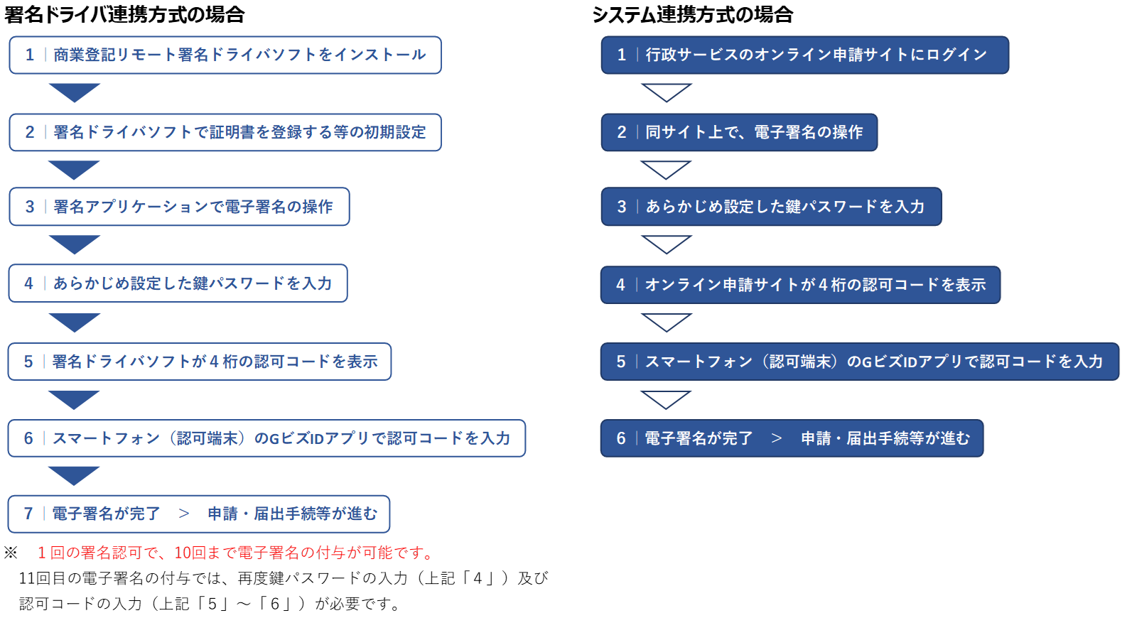 なお、回数制限なく電子署名を行う必要がある場合は、従前どおりファイル形式の電子証明書をご利用いただくなど、商業登記リモート署名以外の方法で電子署名を行っていただく必要がありますので、ご留意願います。