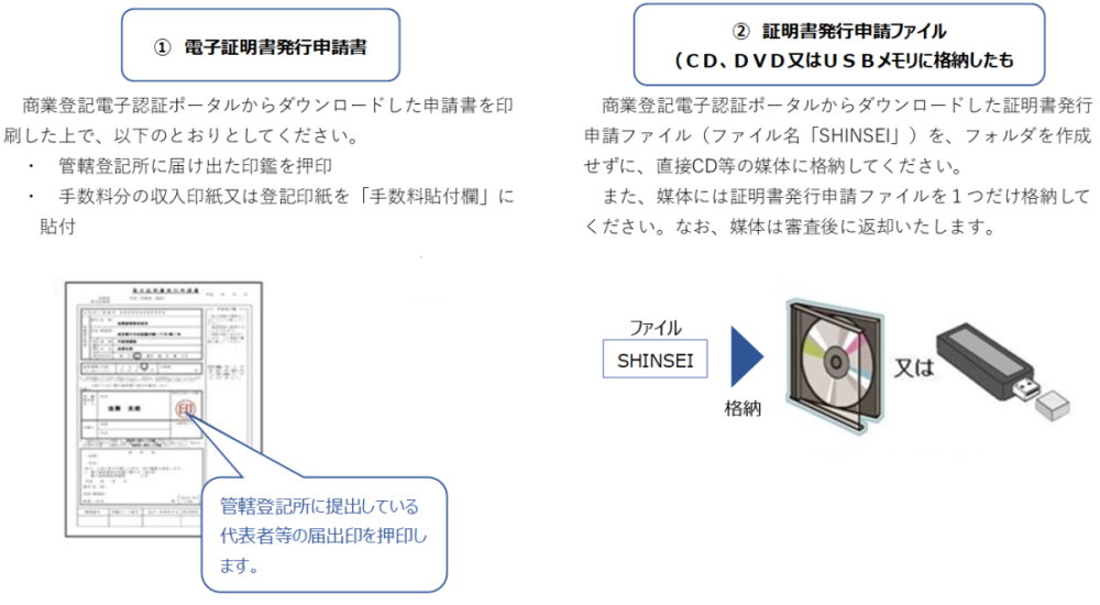商業登記電子認証ポータルで作成した申請書等のデータを使って、管轄登記所(会社・法人の本店・主たる事務所の所在地を管轄する登記所)に対して、電子証明書の発行申請を行います。申請方法は、窓口へ書面・データを持参する、又は郵送するか、オンライン申請する方法があります。