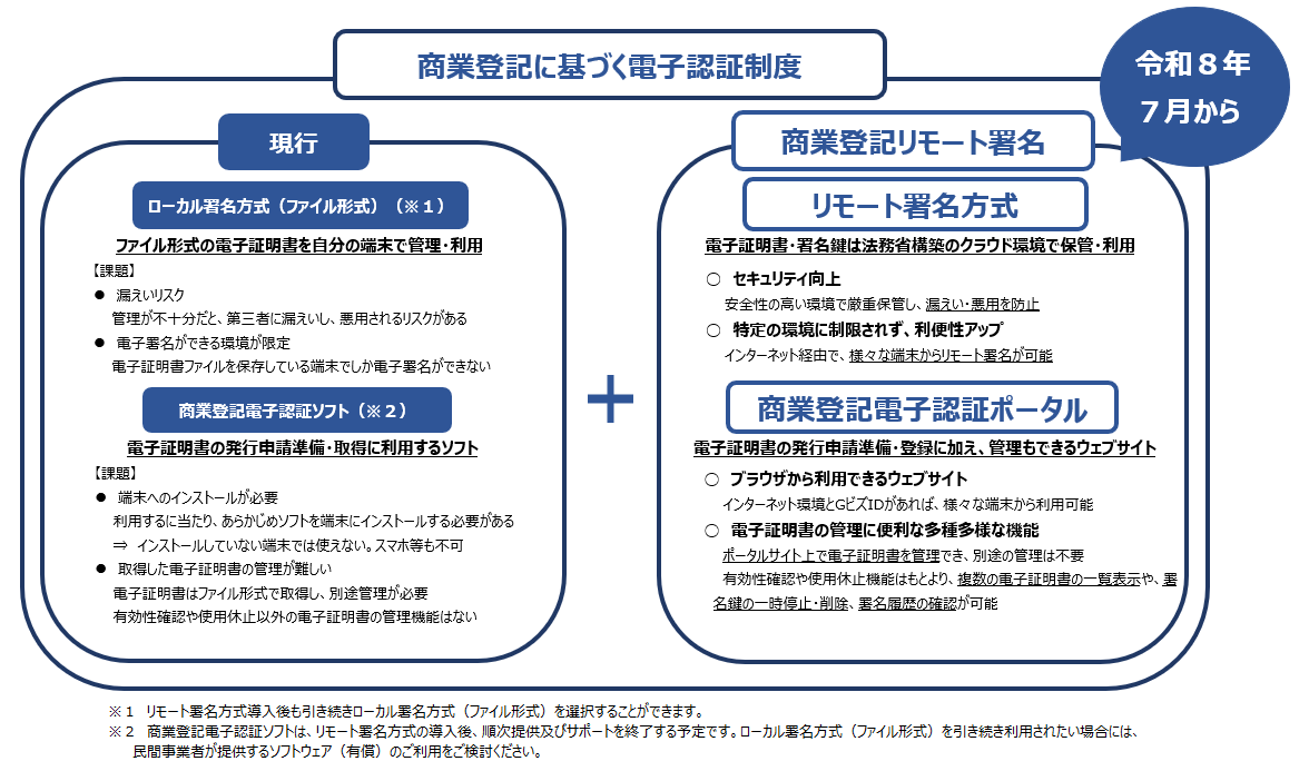 法務省及びデジタル庁では、商業登記電子証明書の安全性と利便性を向上させるため、令和8年7月に「商業登記リモート署名」の導入を予定しています。この特設ページでは、令和8年7月に導入予定の「商業登記リモート署名」について解説するとともに、その利用方法についてご案内します。