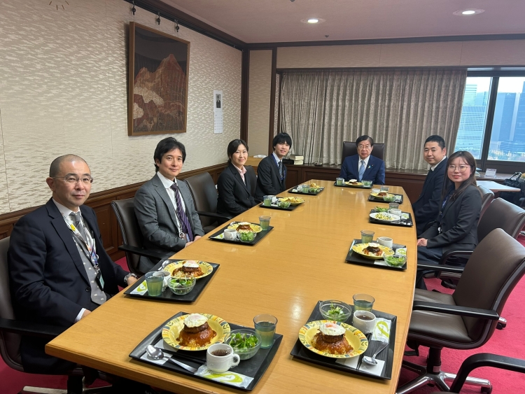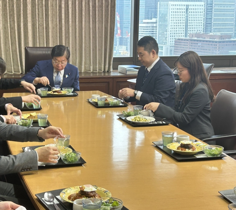 法務省では、網走刑務所の監獄和牛、横浜刑務所のパスタ、沼田町就業支援センターの椎茸、茨城就業支援センターの米、鹿児島刑務所の煎茶等を使ったメニューが提供され、平口法務大臣は、法務省職員と一緒に網走刑務所監獄和牛のロコモコを召し上がりました。