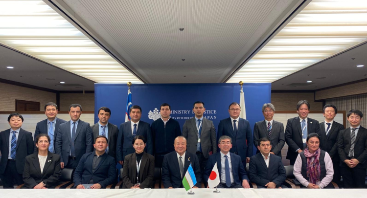 福山政務官と同一行の団長であるルスタンベコフ・ノジムベク ウズベキスタン司法省法執行部長は、現在進めている行政手続法の共同研究等について意見交換をしました。