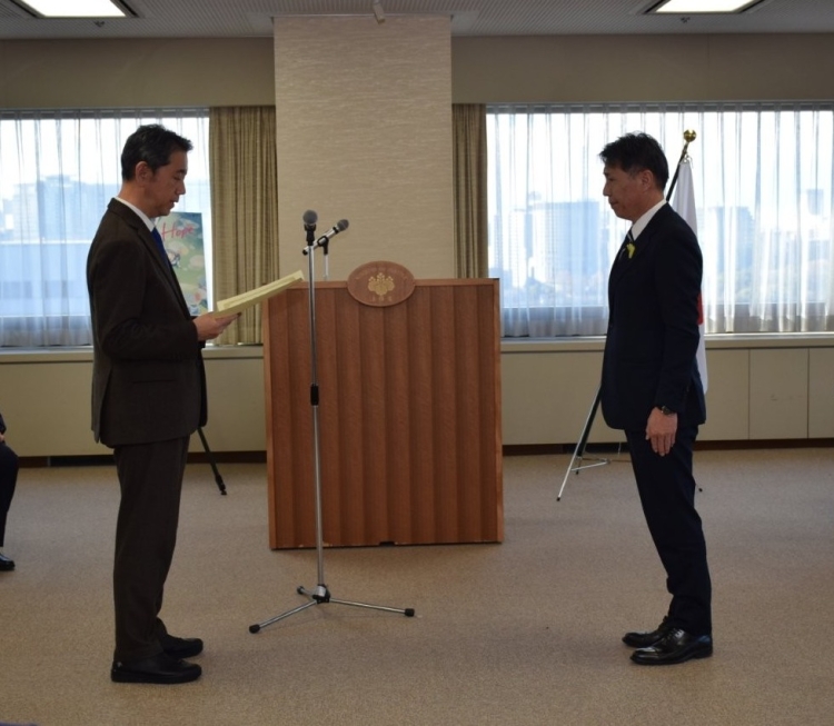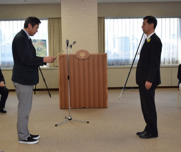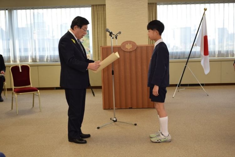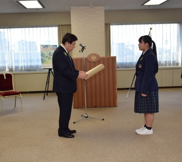 表彰式では、平口法務大臣が、足立さんと藤田さんに対して表彰状とトロフィーを贈呈し、お二人の作文を読んでの感想とお祝いを述べました。