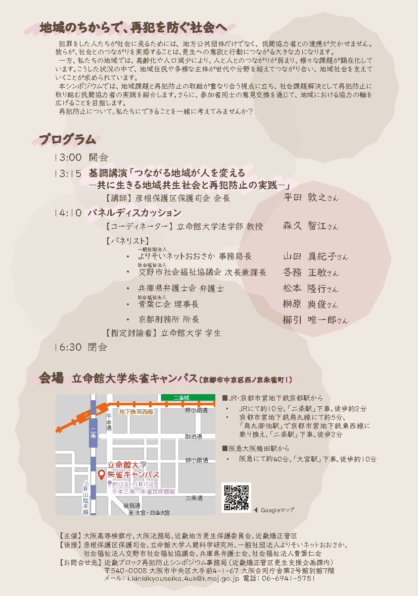 2次元コードの読取ができない方は、チラシ記載の「申込方法(2)FAXで申込」に必要事項を記入の上、FAX:087-826-1285にお申し込みいただくか、【件名に「再犯防止シンポジウム申込」、本文に氏名(ふりがな)、住所、職業、電話番号】をご記載の上、【3.takamatsukyous.d4u@i.moj.go.jp】へ送信してください。