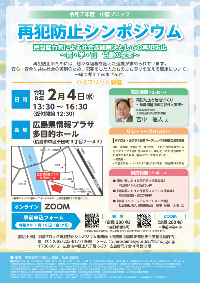 令和7年度は、「民間協力者による社会課題解決としての再犯防止の取組」をメインテーマとして、各矯正管区主催の下、全国8のブロックで再犯防止シンポジウムを開催します。