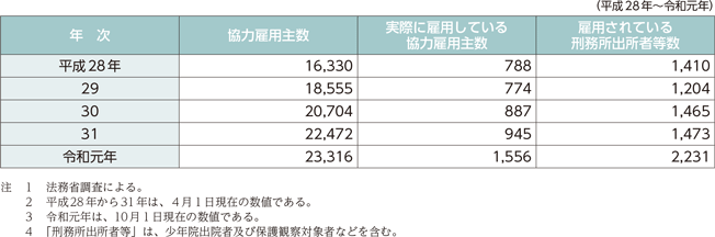 協力雇用主数は、近年増加傾向にあり、2019年(令和元年)10月1日現在、2万3,316社であった。また、実際に刑務所出所者等を雇用している協力雇用主数については、「宣言:犯罪に戻らない・戻さない」(2014年(平成26年)12月16日犯罪対策閣僚会議決定)において、2020年(令和2年)までに約1,500社にまで増加させるとの数値目標が設定されていたところ、2019年10月に1,556社と目標を達成した。また、協力雇用主に雇用されている刑務所出所者数についても、ほぼ横ばいで推移していたが、2019年10月時点では、2,231人と大幅に増加した。