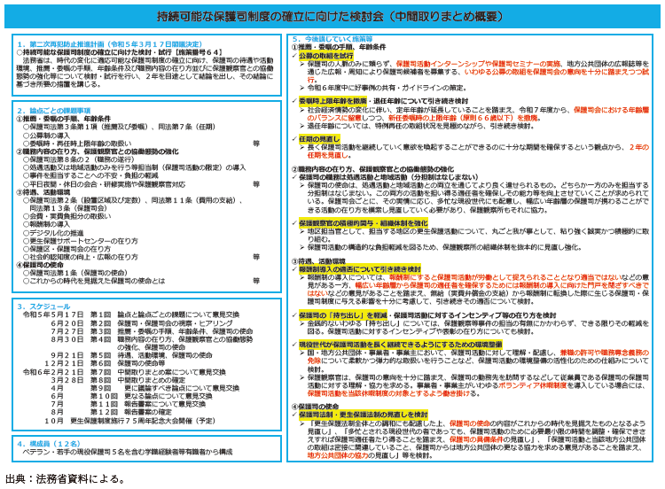 こうした状況を踏まえ、第二次計画においては、「持続可能な保護司制度の確立に向けた検討・試行」を行うこととされ、2023年(令和5年)5月、法務省に「持続可能な保護司制度の確立に向けた検討会」(以下「検討会」という。)を設置し、所要の検討を進め、2024年(令和6年)3月に中間取りまとめを行った(資6-64-1参照)。