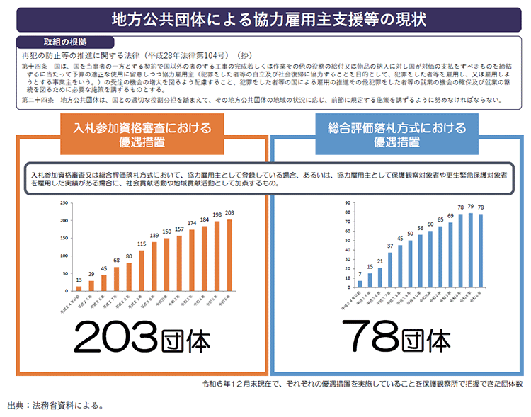 以上のほか、令和6年12月末現在、全国の都道府県及び市区町村のうち、協力雇用主としての刑務所出所者等の雇用実績等について、入札参加資格の審査において評価している地方公共団体は203団体、総合評価落札方式において評価している地方公共団体は78団体であった(資1-9-1参照。法務省取りまとめ)。