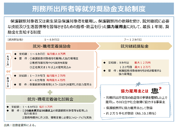 法務省は、刑務所出所者等が雇用主に業務上の損害を与えた場合等に見舞金が支払われる身元保証制度(資1-11-1参照)の活用、刑務所出所者等と雇用主の双方への寄り添い型の支援を行う更生保護就労支援事業(【施策番号7ウ】参照)の実施、刑務所出所者等を雇用して指導に当たる協力雇用主に対し年間最大72万円を支給する刑務所出所者等就労奨励金支給制度(資1-11-2参照)の活用等により、協力雇用主の不安や負担の軽減を図っている。刑務所出所者等就労奨励金支給制度においては、令和4年度に、他の年齢層と比べて、職場定着に困難を抱えやすい18・19歳の者を雇用し、かつ、その者に対して手厚い指導を行う協力雇用主に対する加算金を導入した。その後も加算金の対象を拡大し、令和5年度からは被雇用者が20歳未満の場合も加算対象とし、令和7年度からは被雇用者が50歳以上の場合も加算対象とし、協力雇用主への支援の更なる充実を図ることとしている。令和6年度は、身元保証を1,320件(令和5年度:1,403件)、刑務所出所者等就労奨励金の支給を2,577件(令和5年度:2,661件)実施した。