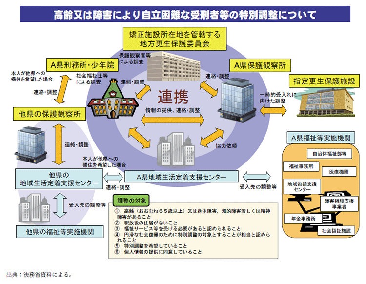 法務省及び厚生労働省は、受刑者等のうち、適当な帰住先が確保されていない高齢者又は障害のある者等が、矯正施設出所後に、福祉サービスを円滑に利用できるようにするため、矯正施設、地方更生保護委員会、保護観察所、地域生活定着支援センター※3等の関係機関が連携して、矯正施設在所中から必要な調整を行い出所後の支援につなげる特別調整(資2-28-1参照)の取組を実施している。この取組を促進するため、関係機関において、特別調整の対象者等に対する福祉的支援に係る協議会や、各関係機関等が有している制度や施策について相互に情報交換等を行う連絡協議会等を行っている。
