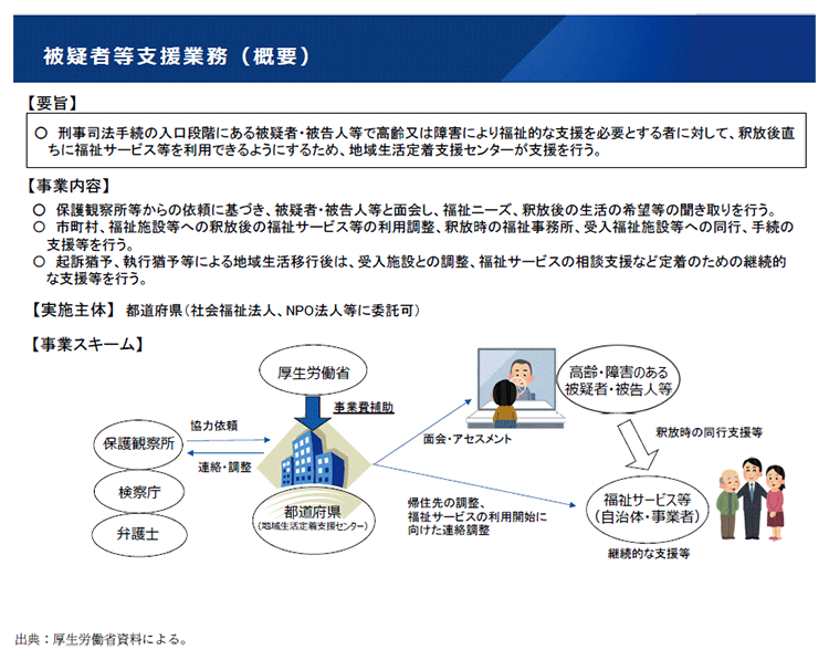 法務省及び厚生労働省は、令和3年度から、刑事司法手続の入口段階にある被疑者・被告人等で、高齢又は障害により自立した生活を営むことが困難な者に対する支援を開始した。具体的には、地域生活定着支援センターが実施している地域生活定着促進事業の業務として、新たに被疑者等支援業務を加え、刑事司法手続の入口段階にある被疑者・被告人等で高齢又は障害により自立した生活を営むことが困難な者に対して、地域生活定着支援センターと検察庁、弁護士会、保護観察所等が連携し、釈放後直ちに福祉サービス等を利用できるように支援を行うとともに、釈放後も地域生活への定着等のために支援等を行う取組を実施している(資2-31-1参照)。