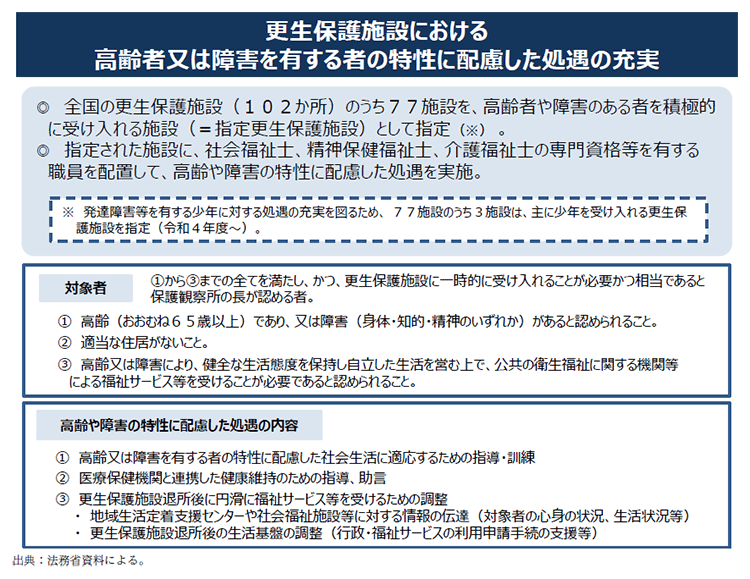法務省は、一部の更生保護施設を指定更生保護施設に指定し、社会福祉士等の資格等を持った職員を配置し、高齢者又は障害のある者の特性に配慮しつつ社会生活に適応するための指導を行うなどの特別処遇(資2-32-1参照)を実施している。指定更生保護施設の数は、令和6年度は77施設であり、令和6年度に特別処遇の対象となった者は、1,877人(令和5年度:1,860人)であった。
