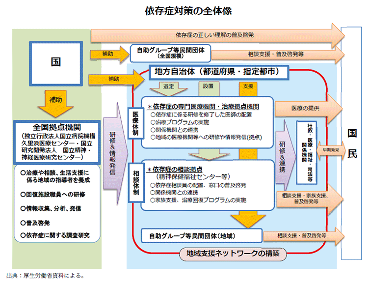 厚生労働省は、薬物依存症を含む依存症対策について、各地域において、医療体制や相談体制の整備を推進するとともに、地域支援ネットワークの構築、依存症全国拠点機関による人材育成・情報発信、依存症の正しい理解の普及啓発等を総合的に推進している(資2-38-1参照)。