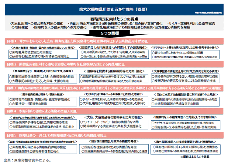 令和5年8月8日、薬物乱用対策推進会議において、令和10年8月までの取組事項等を取りまとめた「第六次薬物乱用防止五か年戦略」が決定された。