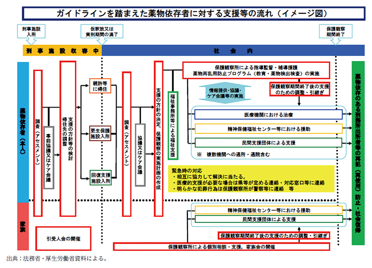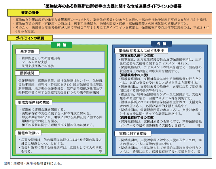 法務省及び厚生労働省は、平成27年に策定された「薬物依存のある刑務所出所者等の支援に関する地域連携ガイドライン」(資2-38-3参照)に基づき、保護観察所と地方公共団体、保健所、精神保健福祉センター、医療機関その他関係機関とが定期的に連絡会議を開催するなどして、地域における支援体制の構築を図っている(資2-38-4参照)。