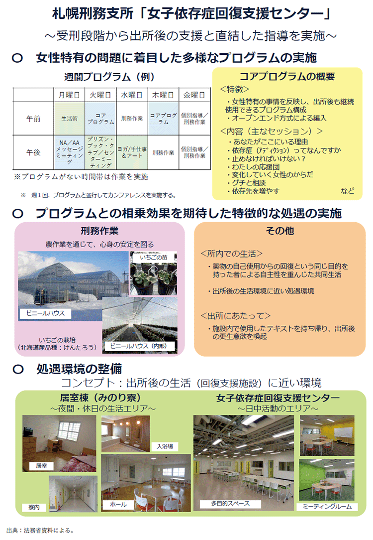 刑事施設では、薬物事犯者の再犯防止のための取組として、薬物依存からの「回復」に焦点を当て、出所後の生活により近い環境下で、社会内においても継続が可能となるプログラムを受講させるとともに、出所後に依存症回復支援施設に帰住等するための支援を行う女子依存症回復支援事業を、令和元年度から5年間のモデル事業を経て、継続実施している(資2-42-2参照)。