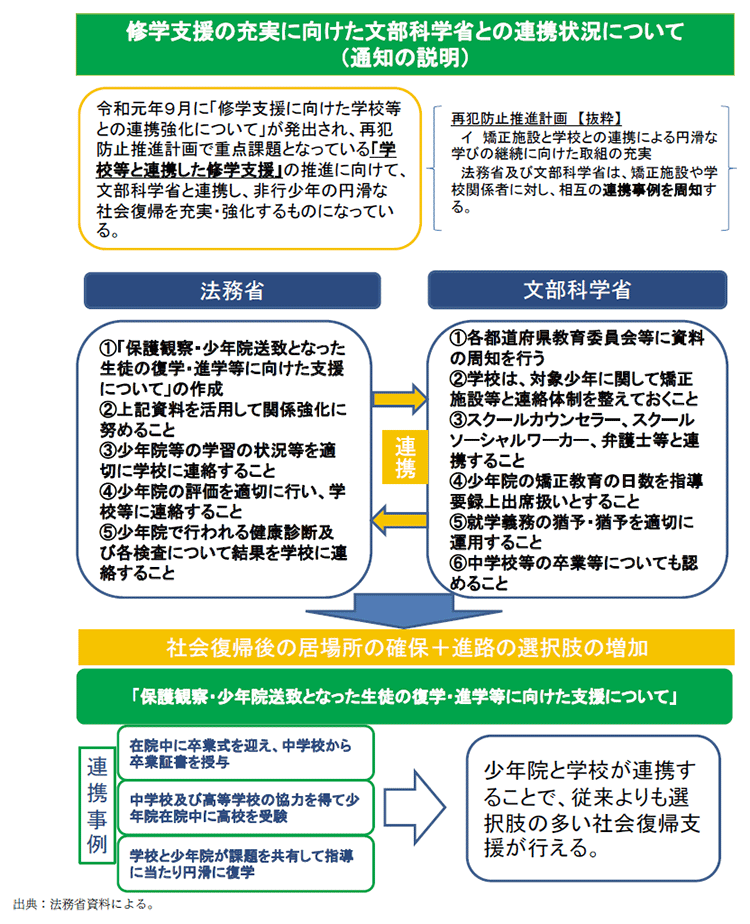法務省及び文部科学省は、令和元年6月に、矯正施設における復学手続等の円滑化や高等学校等の入学者選抜及び編入学における配慮を促進するため、相互の連携事例を取りまとめ、矯正施設、保護観察所及び学校関係者に対して周知し(資3-45-1参照)、さらに令和5年12月には、改訂版※13の周知を行った。