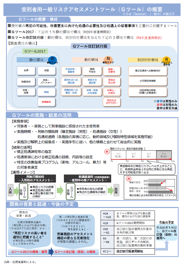法務省は、刑事施設において、犯罪者処遇の基本理念となっている「RNR原則※1」にのっとった処遇を実施するため、平成29年11月から「受刑者用一般リスクアセスメントツール」(以下「Gツール」という。)(資4-50-1参照)を活用している。Gツールは、原則として、全受刑者を対象としており、入所時等に実施する刑執行開始時調査において、これまでの受刑回数や犯罪の内容等、主に処遇によって変化しない要因(静的領域の要因)から、出所後2年以内に再び刑務所に入所する確率を推定するものである。Gツールの実施結果については、犯罪傾向の進度の判定や各種改善指導プログラム(【施策番号62】参照)の対象者選定の際の基礎資料として活用している。令和7年2月からは、静的領域に加え、本人の価値観や認知の偏り等、刑事施設内における指導等を通じて今後も変化し得る要因(動的領域の要因)及び評価への意識や矯正処遇への動機付け、小児期逆境体験等、処遇の浸透のしやすさ等に関わる要因(個別特性領域の要因)の定量的把握ができるよう、Gツールを改訂した「受刑者用一般リスクアセスメントツール改訂試行版」の運用を開始した。また、令和5年12月からは、刑事施設の長からの依頼に基づく少年鑑別所における処遇鑑別も活用しており、若年者を対象とする鑑別等を通じて蓄積した少年鑑別所の専門的知識及び技術について、若年受刑者を始めとする受刑者に対する処遇に活用することにより、一層の充実を図っている。