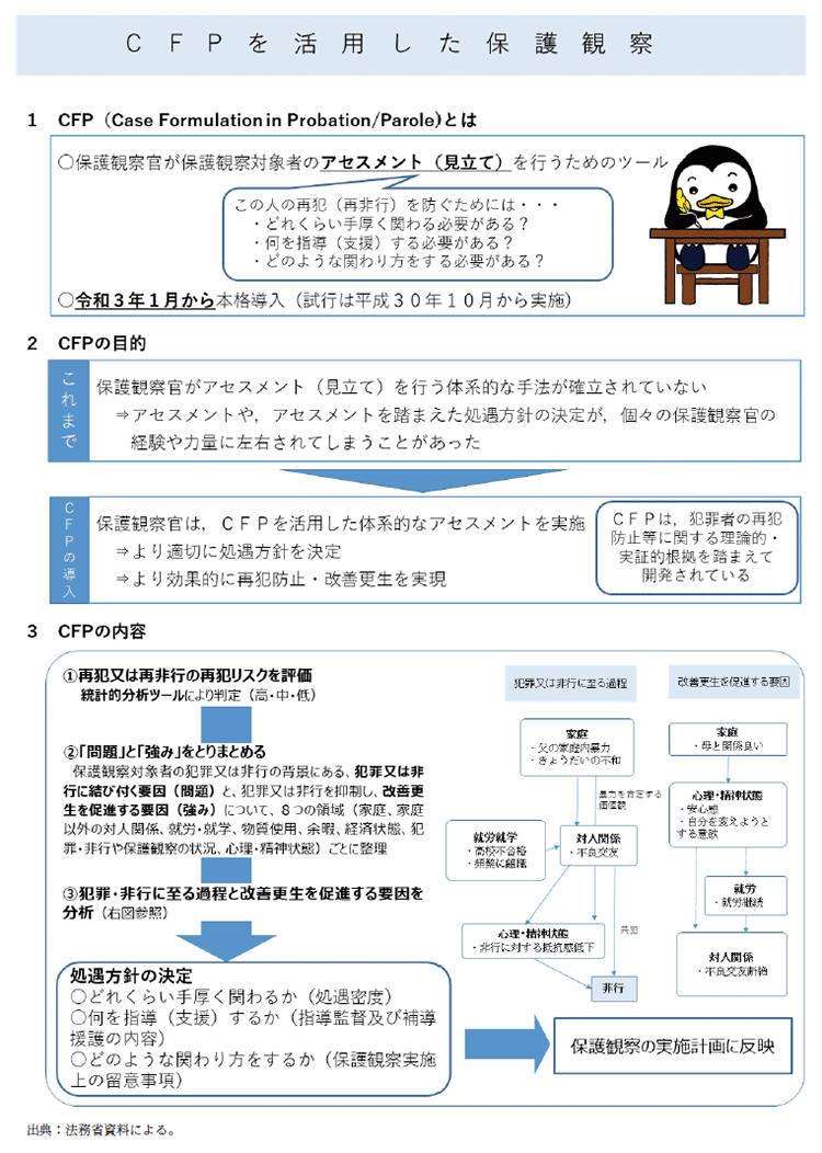保護観察所では、保護観察対象者に対して効果的な指導・支援を行うためのアセスメントツール(以下「CFP※5」という。)(資4-50-3参照)を開発し、令和3年1月から実施している。CFPは、保護観察対象者の特性等の情報について、犯罪や非行に結び付く要因又は改善更生を促進する事項を抽出し、それぞれの事項の相互作用、因果関係等について分析して図示することにより、犯罪や非行に至る過程等を検討し、再犯リスクを踏まえた適切な処遇方針の決定に活用するものである。引き続き、保護観察所における活用状況をモニタリングしつつ、保護観察終了後も見据えた刑事司法関係機関や医療・保健・福祉機関等との連携にも資するものとすることを目指している。