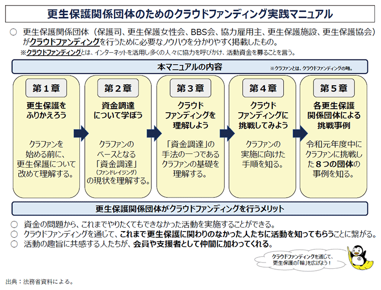 加えて、クラウドファンディングを活用した民間資金調達に関する実践研究を行い、更生保護関係団体による効果的な民間資金の活用及び更生保護や再犯防止の取組に対する国民の理解促進を図ることを目的とした実践マニュアル(資5-74-2参照)や、BBS会の各種研修用教材として、クラウドファンディングの実践方法を紹介する動画を作成し、更生保護女性会やBBS会を始めとする更生保護関係団体による犯罪予防・再犯防止活動等の継続を支援している。