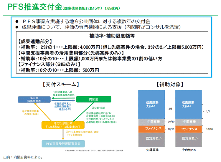 内閣府は、令和3年2月に、SIBを含むPFS事業を実施しようとする国又は地方公共団体等が当該事業を円滑に実施できるよう、PFS事業の実施に関する一連の手続の概説等を示した「成果連動型民間委託契約方式(PFS:Pay For Success)共通的ガイドライン」※14を作成、公表し、令和6年2月に改訂した。また、令和3年度からSIBを含むPFS事業を実施する地方公共団体を対象とする「成果連動型民間委託契約方式推進交付金事業」(資5-74-3参照)を開始し、PFS事業における委託費のうち、成果連動支払部分等について複数年にわたる補助を行うとともに、評価の専門機関が当該事業の成果評価について支援を行っている。