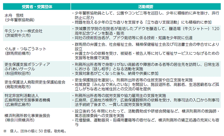内閣官房及び法務省は、平成30年度から、内閣総理大臣が顕彰する「安全安心なまちづくり関係功労者表彰」において、再犯の防止等に関する活動の推進において特に顕著な功績又は功労のあった個人又は団体を表彰している。令和6年度は、法務省を含む関係省庁や地方公共団体から推薦を得て、再犯を防止する社会づくりについて功績・功労があった個人及び団体を表彰した※17(資5-76-1参照)。