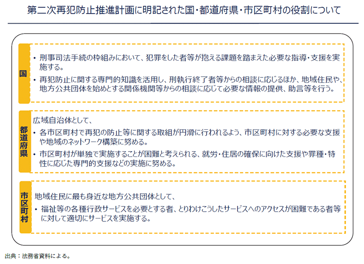 再犯防止に関して、国、都道府県及び市区町村が担う役割(資6-77-1参照)が第二次再犯防止推進計画に明記されたところ、市区町村が、犯罪をした者等の個々のニーズに応じた伴走型支援を実施するなどして、前記の役割を十全に果たすことができるよう、法務省は、市区町村に対して再犯防止に関する必要な情報提供を行っている。