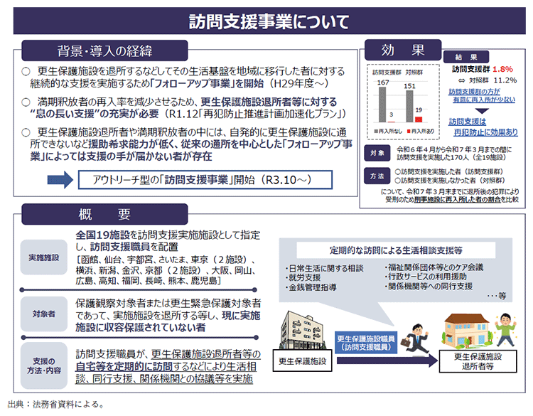 法務省は、更生保護施設退所者等が地域生活に定着するまでの間の継続的な支援として、平成29年度から更生保護施設に通所して支援を受けるフォローアップ事業(【施策番号20】参照)を委託する取組を実施してきたところ、自発的に更生保護施設に通所できないなど、フォローアップ事業では支援の手が届かない者に対して必要な支援を行うため、令和3年10月からは、自宅等を訪問するなどして生活相談支援等をアウトリーチで行う訪問支援事業の委託も開始した。フォローアップ事業については、令和6年度の委託実人員は1,656人(令和5年度:1,159人)、延べ人員は11,586人(令和5年度:8,505人)であり、訪問支援事業については、令和6年度は、全国19施設において実施し、令和6年度の委託実人員は654人(令和5年度:445人)、延べ人員は5,733人(令和5年度:2,858人)である(資6-87-1参照)。