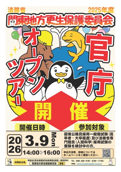 関東地方更生保護委員会及び関東管内の保護観察所で、以下の日程で官庁オープンツアー/国家行政・官庁ツアーを実施します。更生保護の職場を体感できるチャンスです!皆様の参加をぜひお待ちしております!