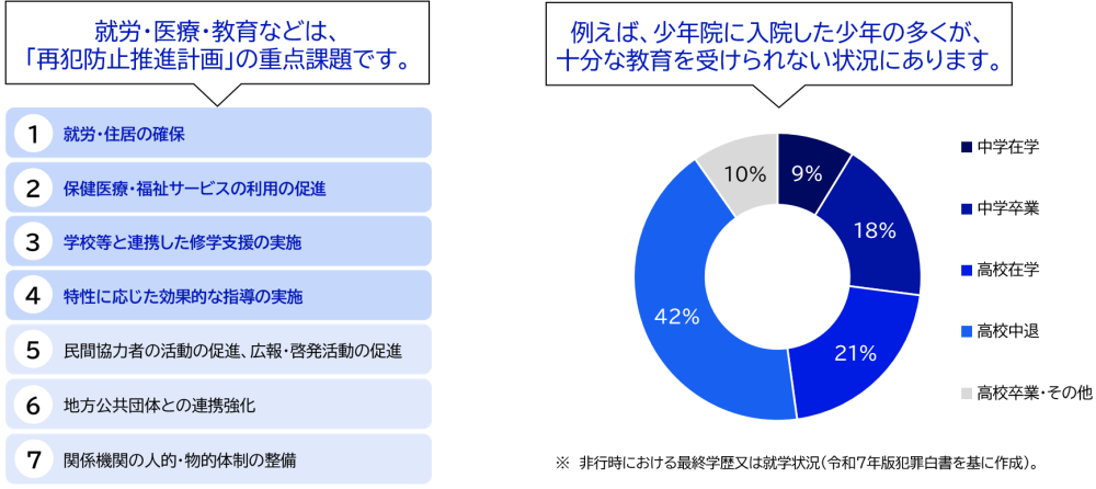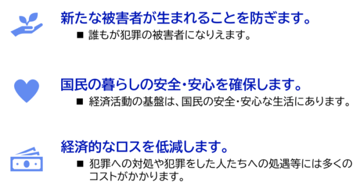 再犯防止のためには、「就労」「医療」「教育」などが、とても重要です。